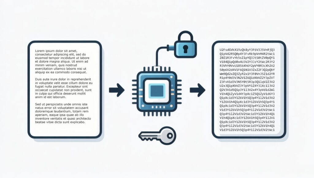 Concrètement, le chiffrement consiste à transformer une information lisible, appelée texte en clair, en une information codée appelée texte chiffré. Cette transformation est réalisée à l’aide d’un algorithme de chiffrement et d’une clé. Sans cette clé, les données apparaissent comme une suite de caractères incompréhensibles.